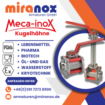 08. Februar 2026 ι Allgemeinmiranox Sortiment mit Meca-Inox erweitert – einem führenden europäischen Hersteller von Kugelhähnen. Mit dieser Zusammenarbeit bieten wir unseren Kunden künftig ein noch breiteres Spektrum für Anwendungen in der Lebensmittel- und Pharmaindustrie.